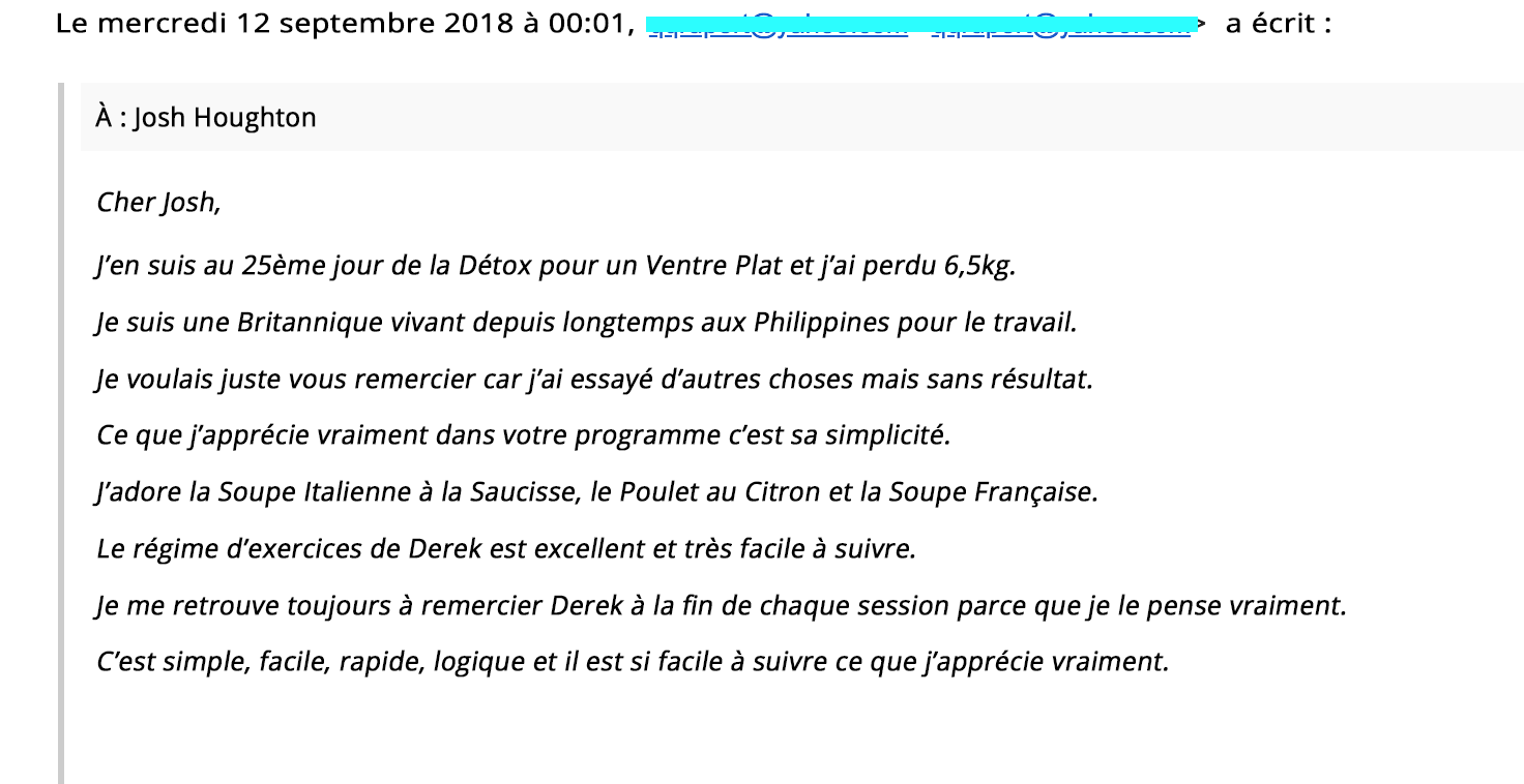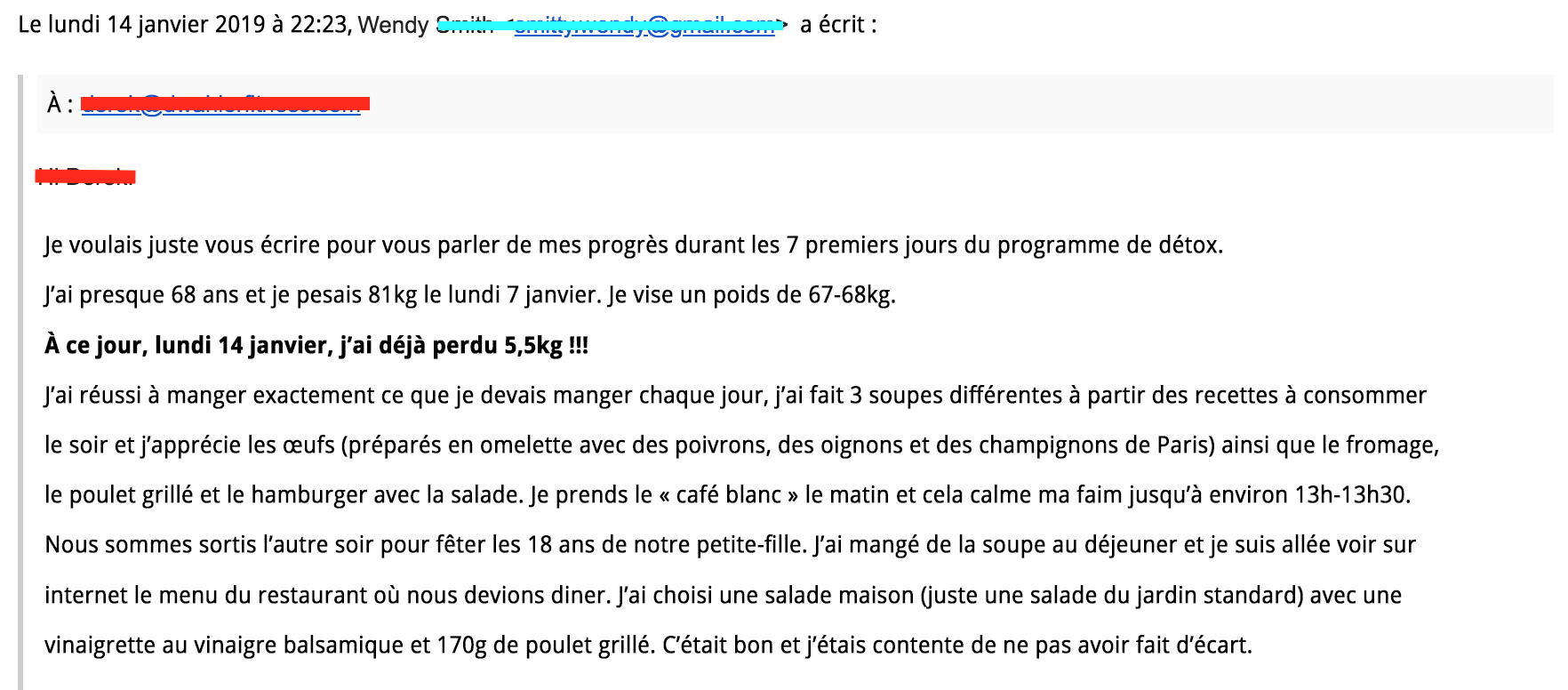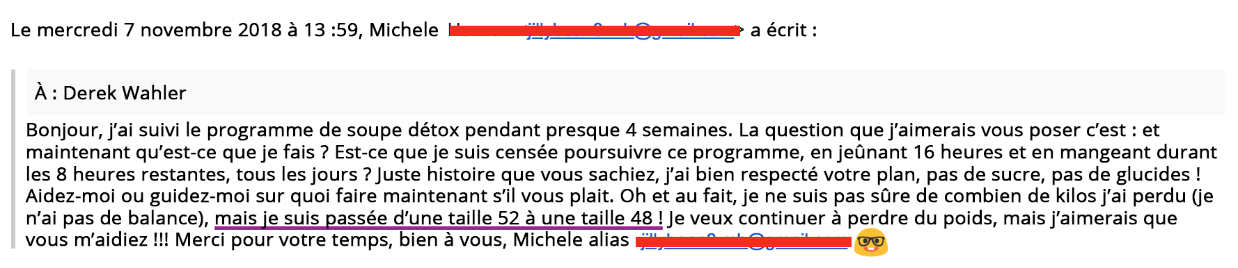 Les résultats individuels peuvent varier d'une personne à l'autre et les témoignages dans cette présentation ne sont pas déclarés représenter des résultats standards ou typiques. Tous les témoignages présentés sont des personnes réelles et peuvent ne pas refléter l'expérience de l'acheteur moyen, et ne sont pas destinés à représenter ou garantir que tous ceux qui achètent connaîtront des résultats identiques ou similaires à ceux indiqués dans les témoignages. Les expériences présentées dans la lettre de vente d'autres personnes peuvent ne pas refléter l'expérience des utilisateurs typiques car chacun est unique. En raison des récentes déclarations de la FTC, il est nécessaire d'identifier ce qu'est un résultat typique. La vérité c'est que la plupart des gens ne passent jamais à l'action avec les produits qu'ils achètent en ligne, donc la plupart du temps les résultats typiques pour perdre du poids sont nuls. La capacité de suivre le programme joue un rôle important. Comme le dit le proverbe : « vous récoltez ce que vous semez ». Les résultats montrés dans la lettre de vente sont destinés à vous montrer ce que les utilisateurs les plus motivés du Régime Soupe Rapide de 14 Jours ont vécu. De plus, comme pour toutes choses, vous devriez prendre le temps de faire vos propres recherches.