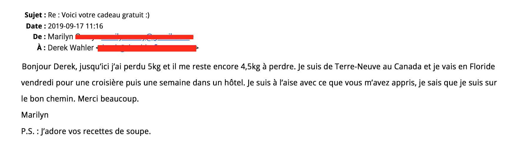 Si vous suivez le programme et que vous réalisez qu’il n’est tout simplement pas fait pour vous, envoyez-moi un courriel et je serai heureux de vous rembourser intégralement et sans poser de question.